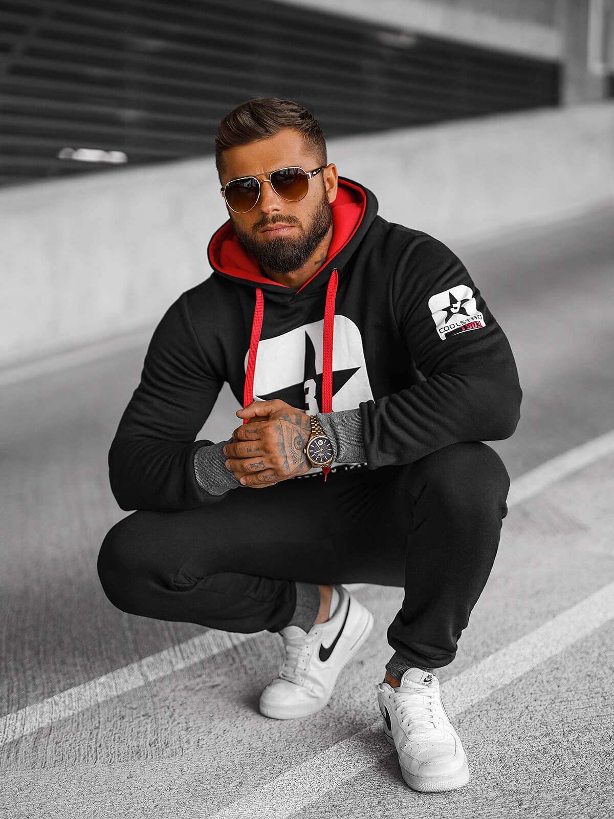 Džemperis su gobtuvu ir kelnės su šoninėmis kišenėmis yra ne tik praktiški, bet ir suteikia charakterio bendrai išvaizdai. Užbaigta rankogaliais tiek džemperis, tiek kelnės puikiai priglunda, pabrėždami vyrišką stilių.