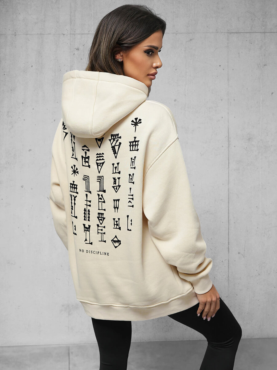 Madingas siuvinėtas užrašas, kengūros kišenė, apačioje ir rankovėse briaunuoti rankogaliai