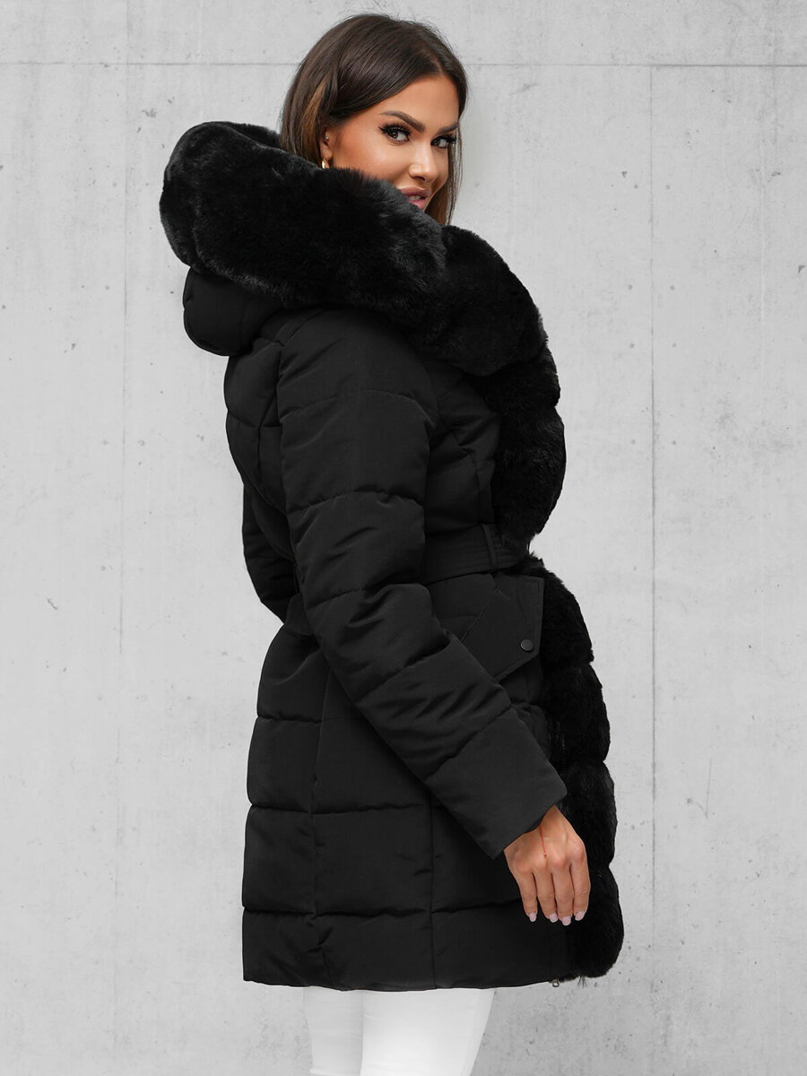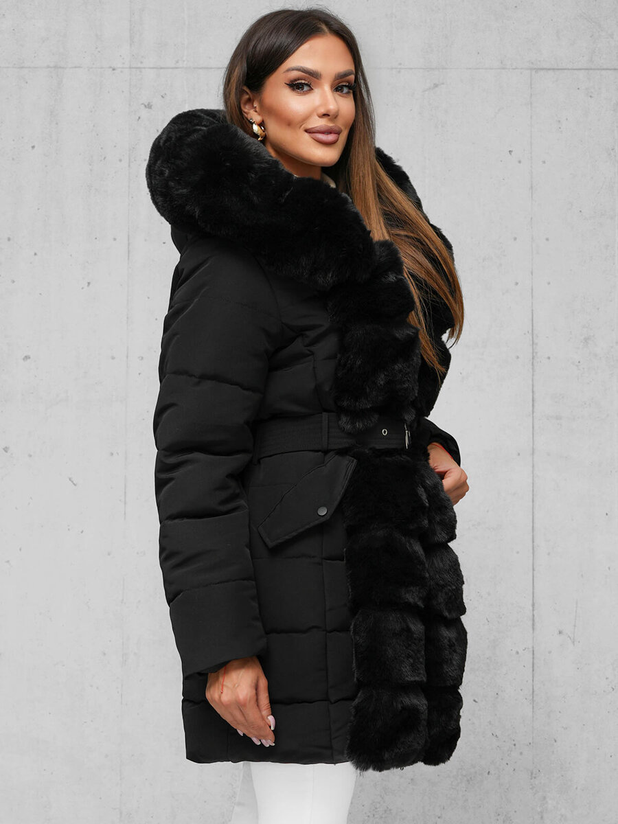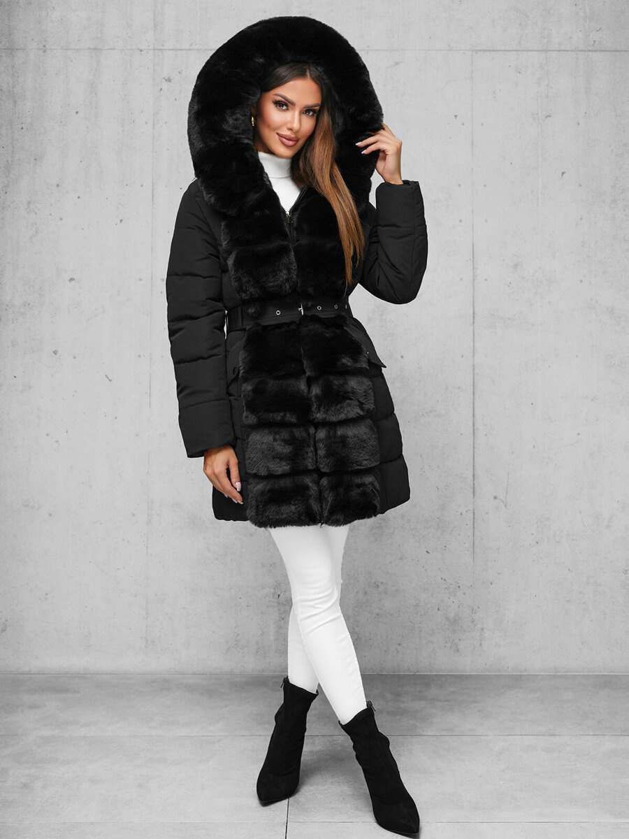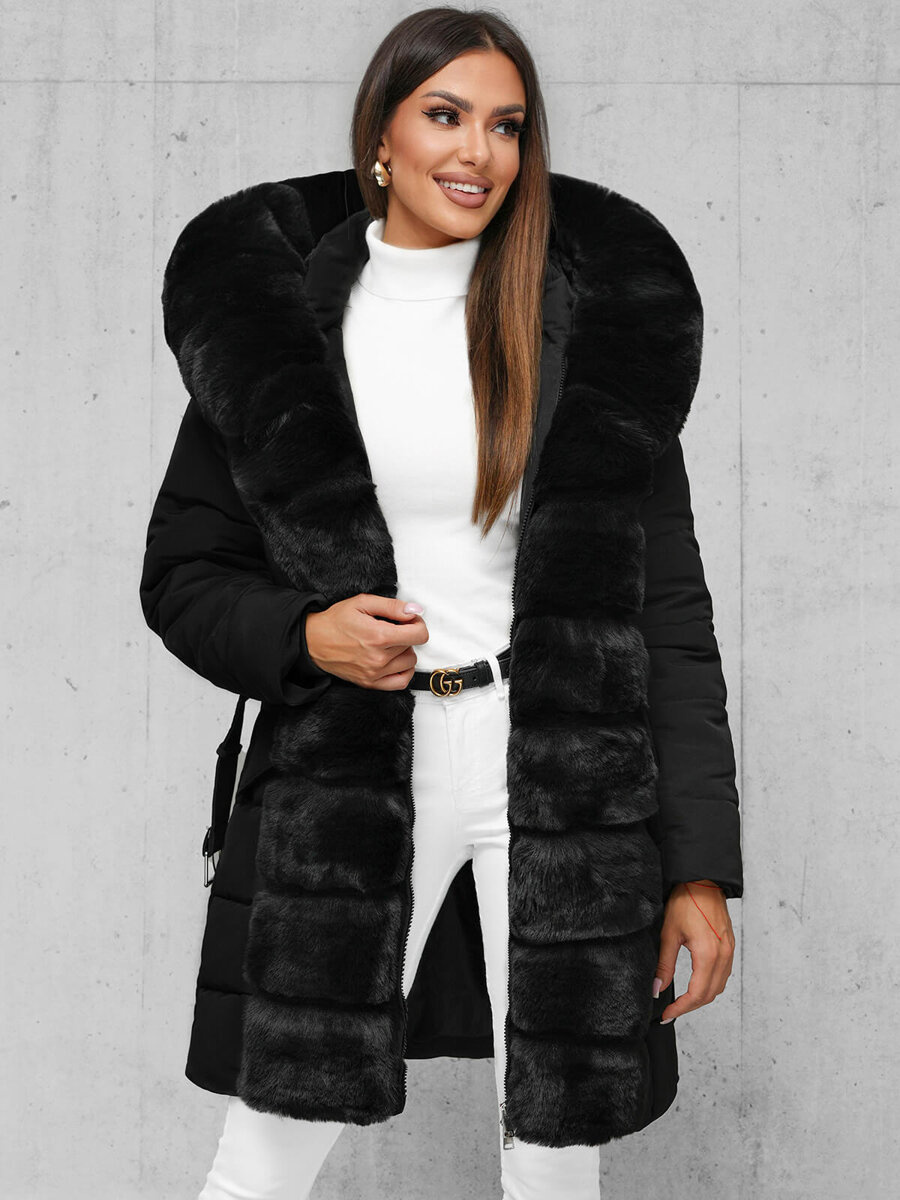 Stilinga ir praktiška moteriška ilga žieminė striukė su kailiu juoda OZONEE JS/11Z8096