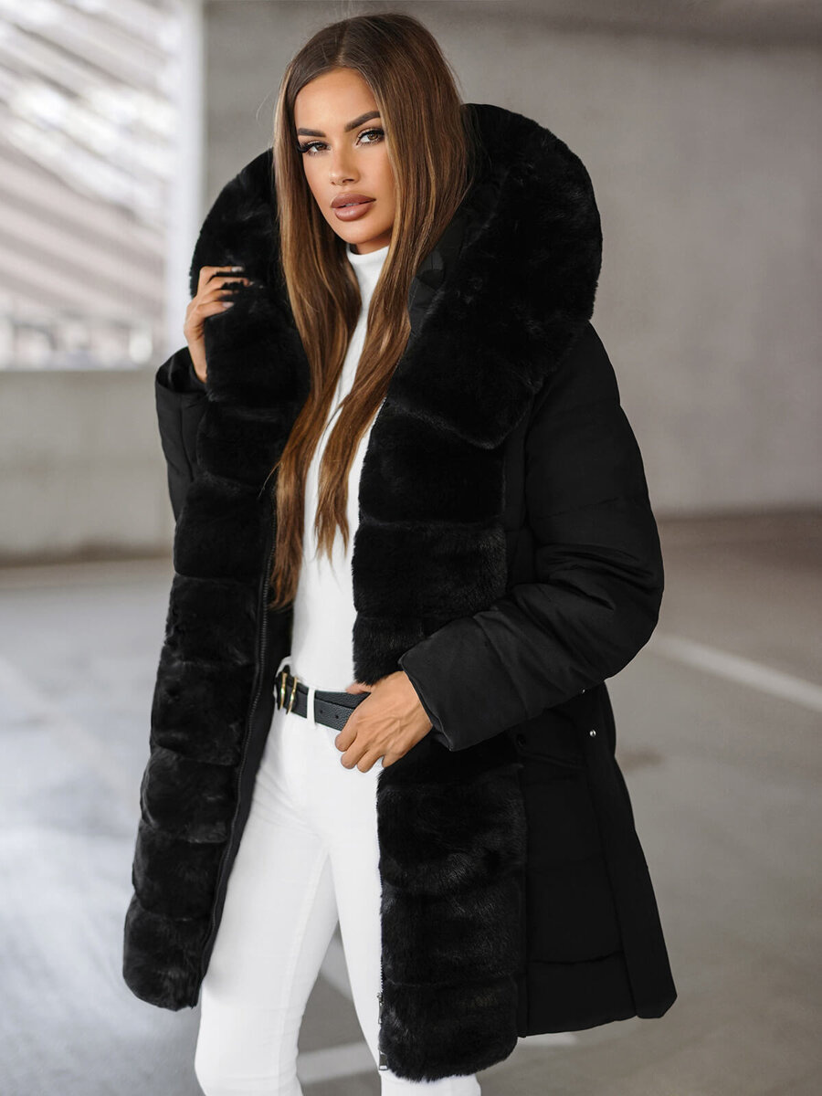 Stilinga ir praktiška moteriška ilga žieminė striukė su kailiu juoda OZONEE JS/11Z8096