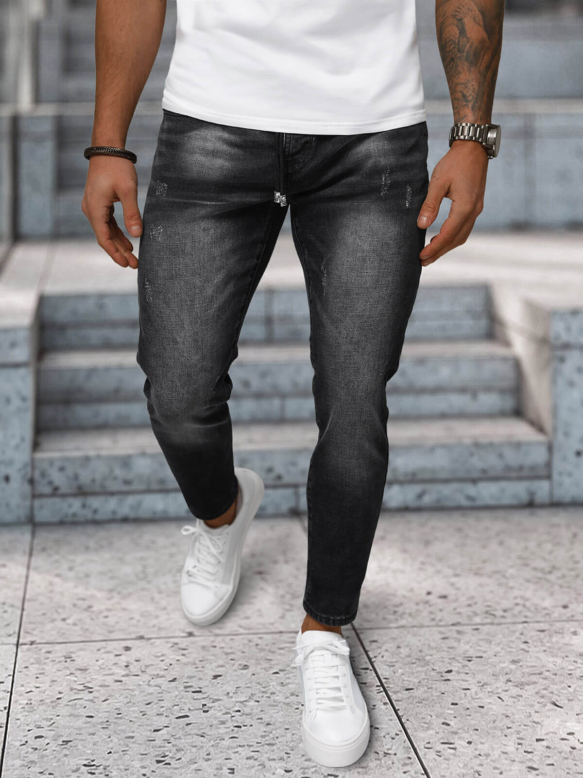- Unikalūs nusitrynimo efektai ant kelnių suteikia šiuolaikišką ir madingą išvaizdą
