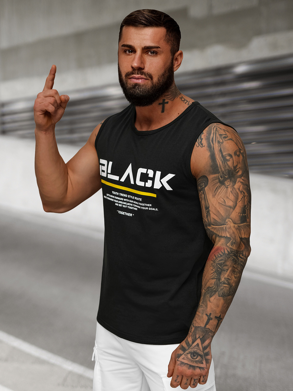 - Šie klasikiniai berankoviai marškinėliai turi apvalią iškirptę ir madingą spaudą priekyje, suteikiantį šiuolaikišką išvaizdą