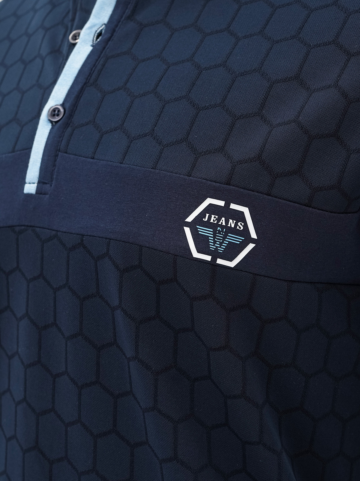 - Klasikinis polo marškinėlių modelis su stovu apykakle ir sagomis, taip pat turi kišenės imitaciją