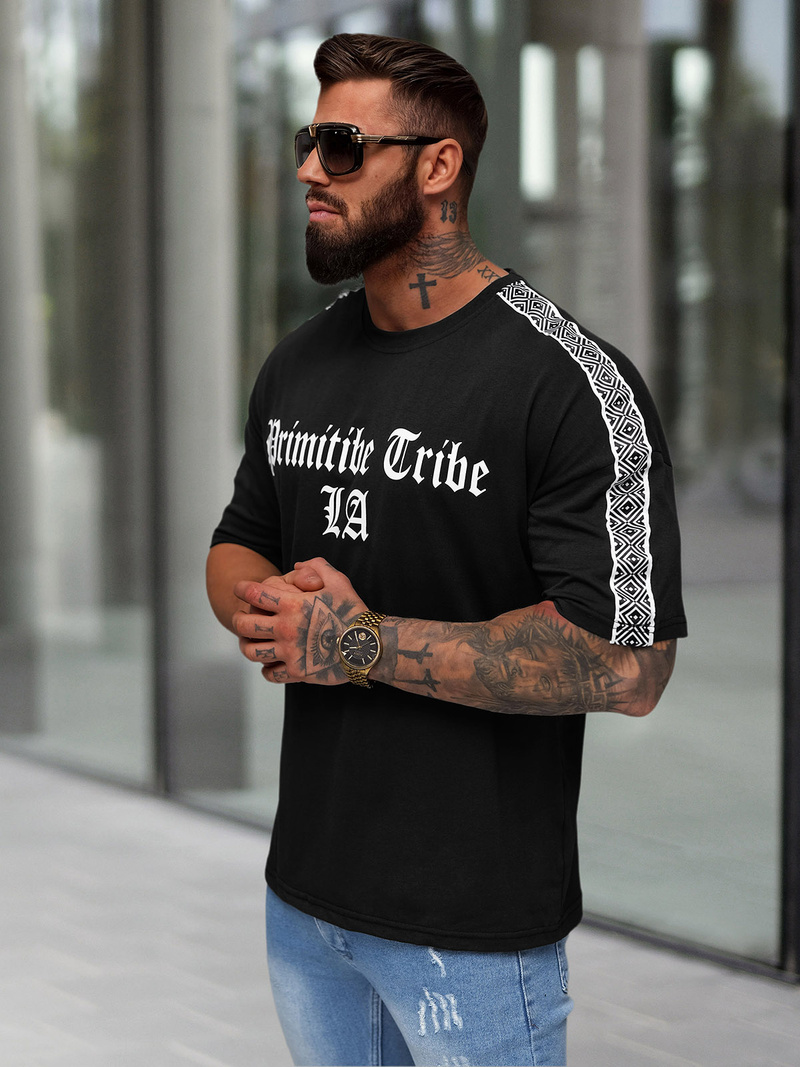 - Marškinėliai turi apvalų kaklą ir dekoratyvines juosteles ant rankovių, suteikiančias unikalų ir stilingą išvaizdą