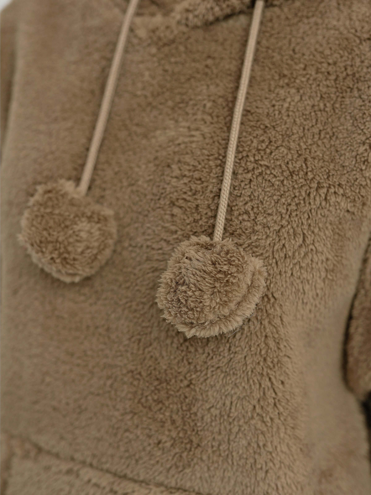 - Moteriškas džemperis su gobtuvu ir dekoratyvinėmis virvelėmis su pomponais