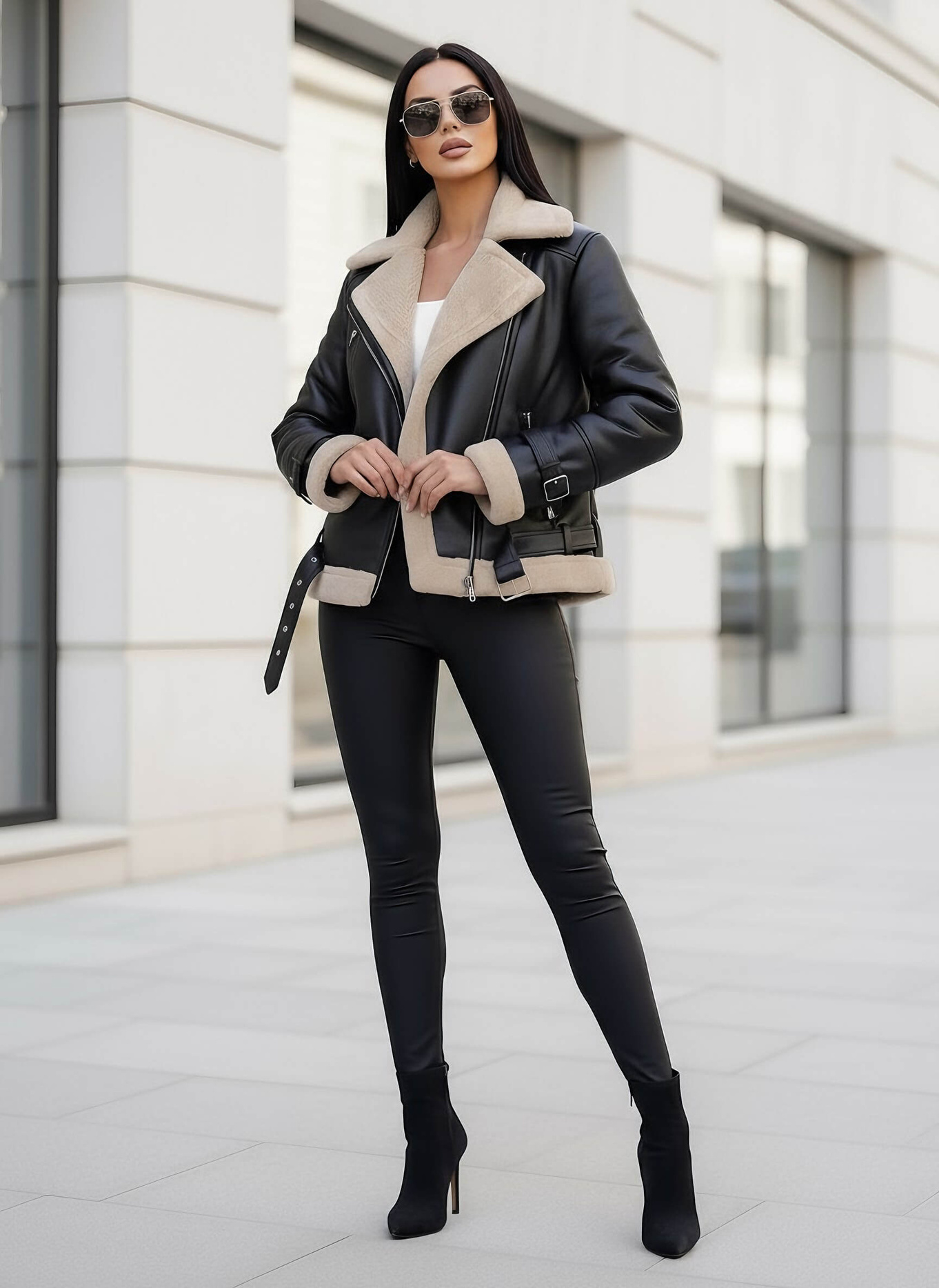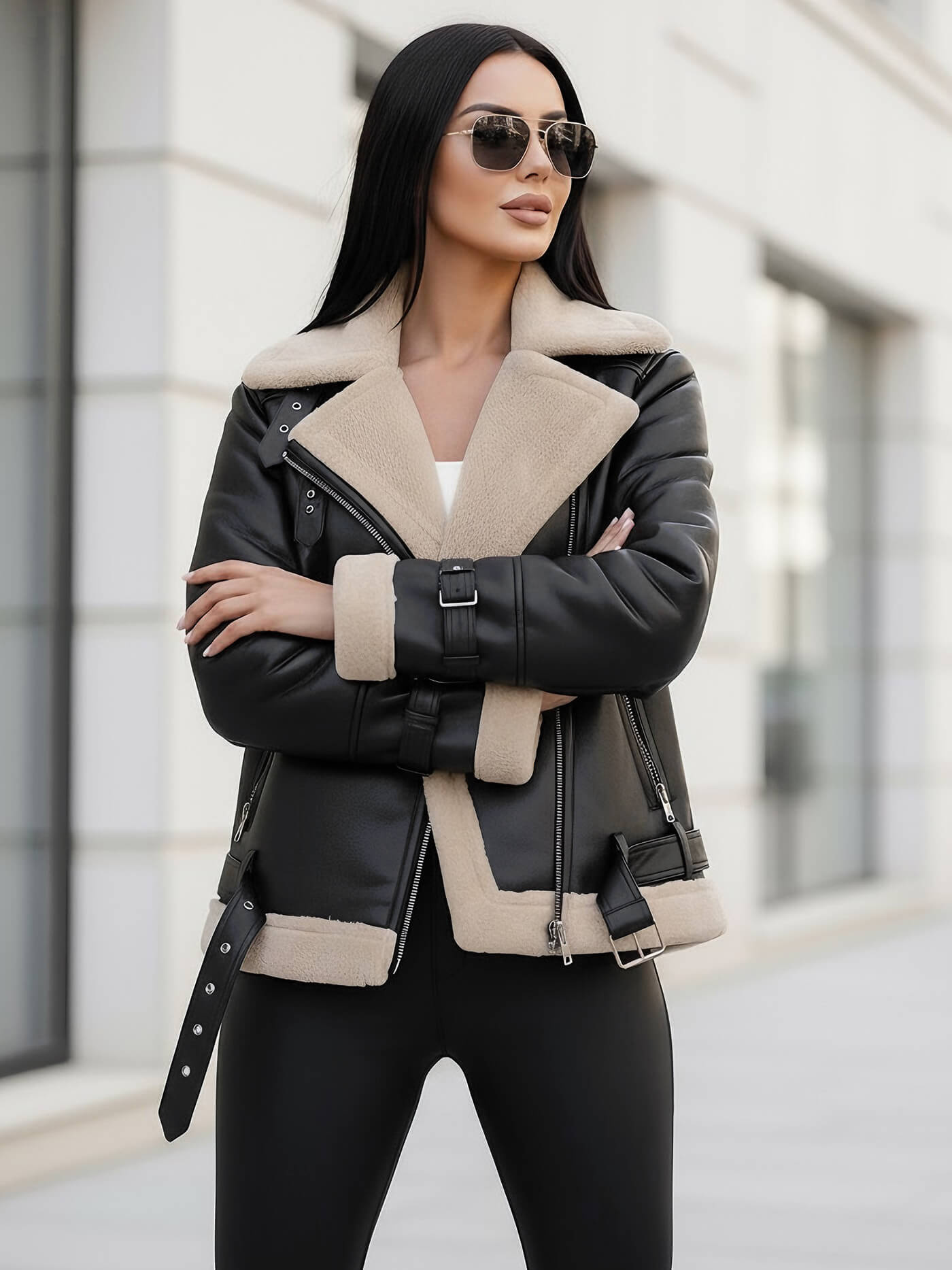 Juodai-smėlinis moteriška odinė striukė OZONEE JS/11Z8177Z