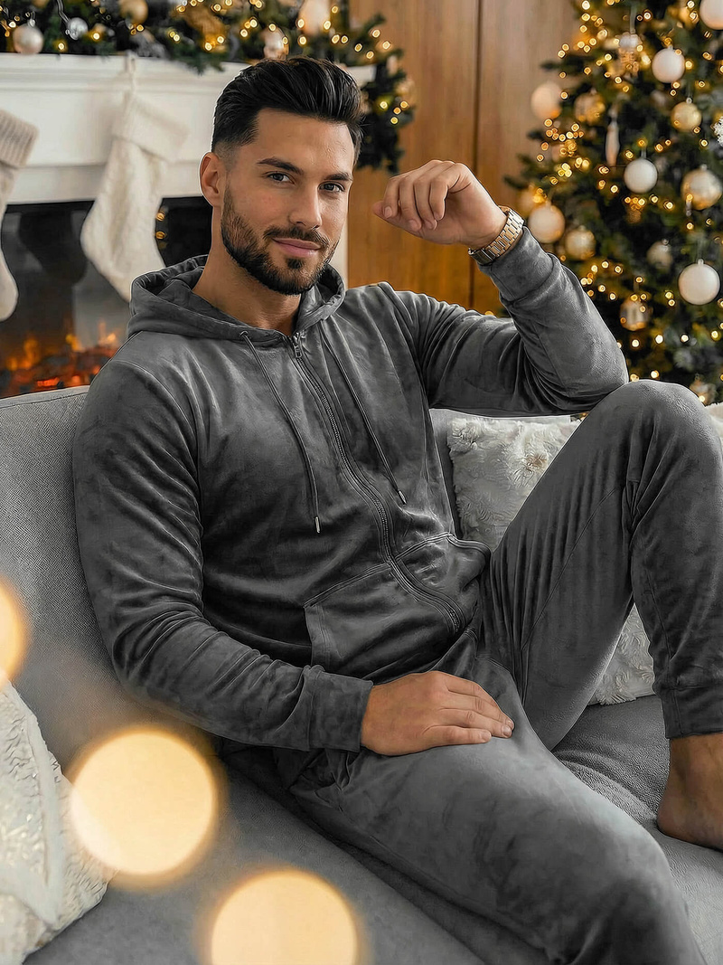 Pristatomas vyriško velūro sportinio kostiumo komplektas - tai patogumo ir madingo dizaino derinys. Jis idealiai tinka kasdieniam dėvėjimui, užtikrina komfortą ir judėjimo laisvę. Atsegamas džemperis su gobtuvu ir kelnės su šoninėmis kišenėmis sudaro vientisą ir praktišką komplektą. Viršutinė ir apatinė dalys užbaigtos briaunuotais kraštais, suteikiančiais sportiškumo.