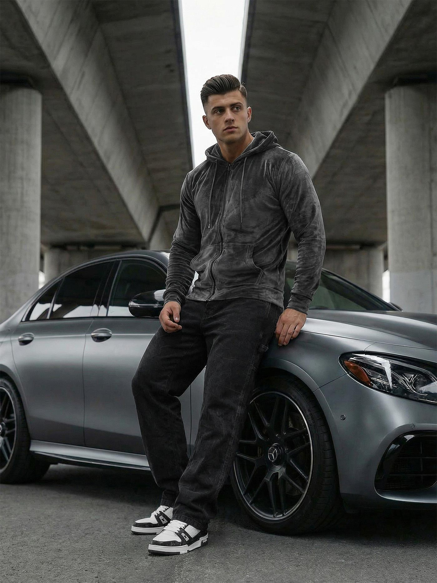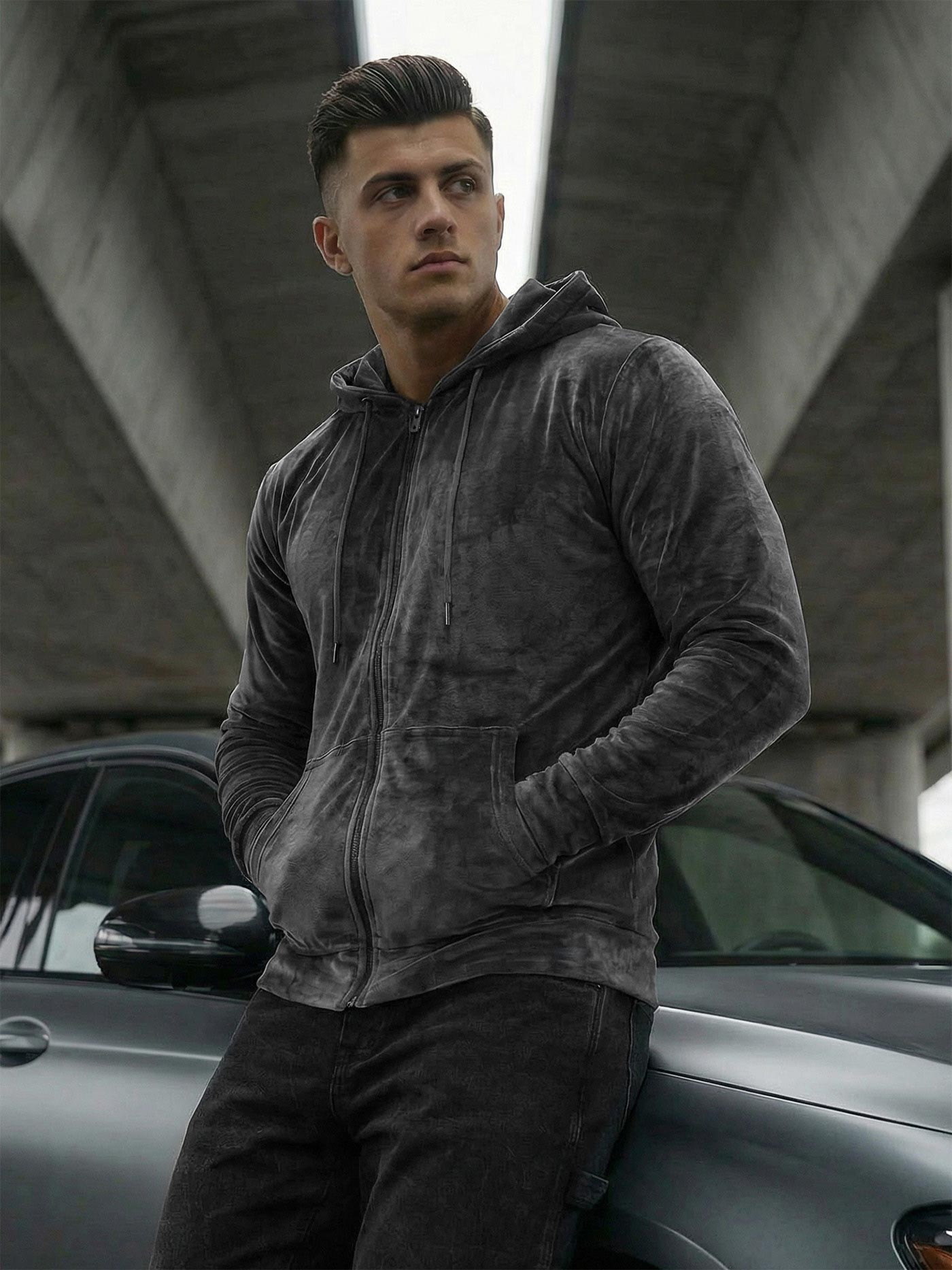 Vyriškas grafito spalvos veliūrinis gobtuvas OZONEE JS/8B1168/6Z - tai patogumo ir modernaus dizaino derinys. Pagamintas iš aukščiausios kokybės medžiagaow, jis užtikrina patogumą visą dieną. Užsegamas užtrauktuku, turi gobtuvą, kuris suteikia išskirtinumo. Apačia ir rankovės, užbaigtos briaunuotu kraštu, pabrėžia sportinį stilių.
